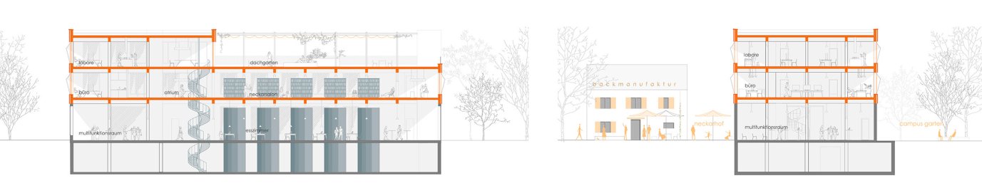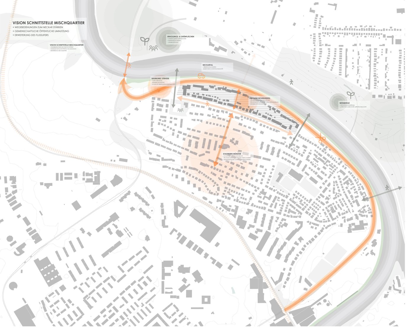 Bei der Voruntersuchung zur Neckarnachbarschaft Münster stand die Beziehung zwischen dem Stadtteil und dem Fluss im Vordergrund. Dabei wurden unterschiedliche Eingriffsmöglichkeiten für eine Öffnung des Quartiers zum Neckar untersucht und dargestellt: von inkrementell, nachbarschaftlich organisierten Wegrechten bis zu urbanen Projekten am Ufer.