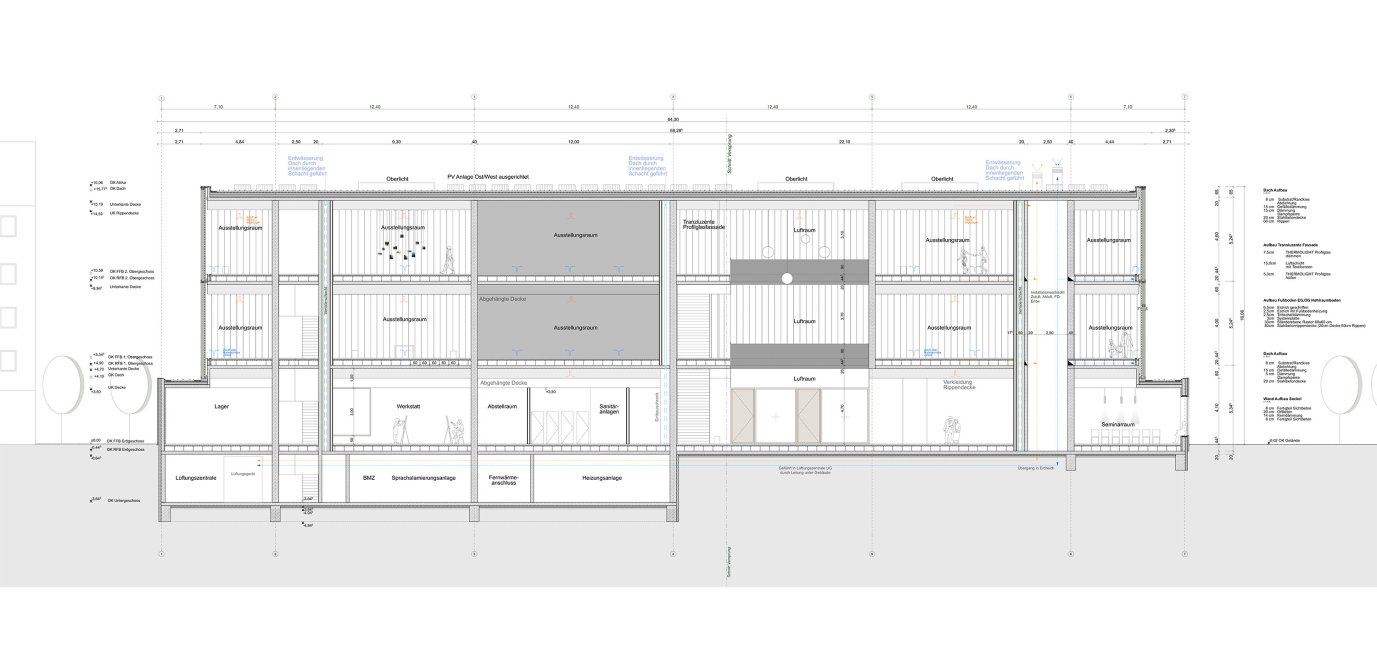 Dieses Projekt beschäftigt sich mit Frage des Sockels in der Stadt. Der Entwurf versucht dem massiven Sichtbetonsockel mit einzelnen großen Öffnungen, einen „schwebenden“ mit einer durchlaufenden transluzenten Hülle versehenen Ausstellungskörper gegenüberzustellen. Die klare konstruktive Gliederung in tragende Schotten, die auch die infrastrukturellen Themen beinhalten schaffen eine überzeugende räumliche Struktur, die einen vielfältigen Ausstellungsbetrieb ermöglicht.