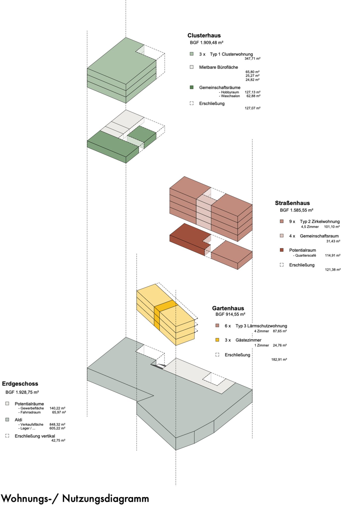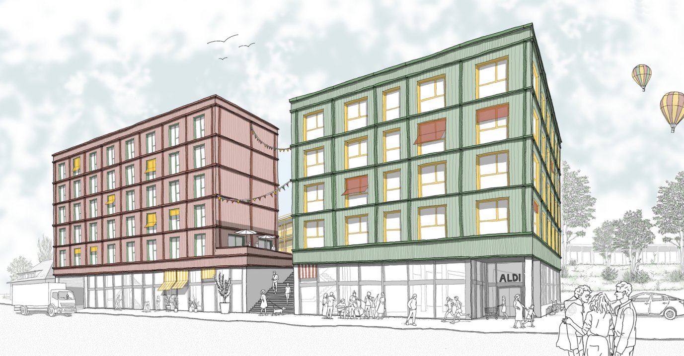 Im Rahmen eines Wettbewerbs der Joanes-Stiftung wurde ein Entwurf gesucht, der Wohnungen mit einem sehr hohen Qualitätsanspruch mit Blick auf vielfältiges und teilweise gemeinschaftliches Wohnen, aber auch Bezahlbarkeit mit einem Supermarkt mit all seinen logistischen Anforderungen verbindet. Die Arbeit löst diese Aufgabe durch drei einander zugewandte, von einer gemeinsamen Ebene aus erschlossene Baukörper in Holzskelettbauweise, die bei relativer Kompaktheit und Dichte eine große Bandbreite an Wohnungstypen anbieten. Das Erdgeschoss ist durch den Treppenaufgang und eine „dicke Wand“ mit gewerblichen und gemeinschaftlichen Nutzungen lebendig. Bereichert wurde die Arbeit am Entwurf durch Fachvorträge zu Befahrbarkeit, Konstruktion und gemeinschaftlichem Wohnen sowie durch eine inspirierende Exkursion mit Führungen durch verschiedene Wohnbauten in Zürich.