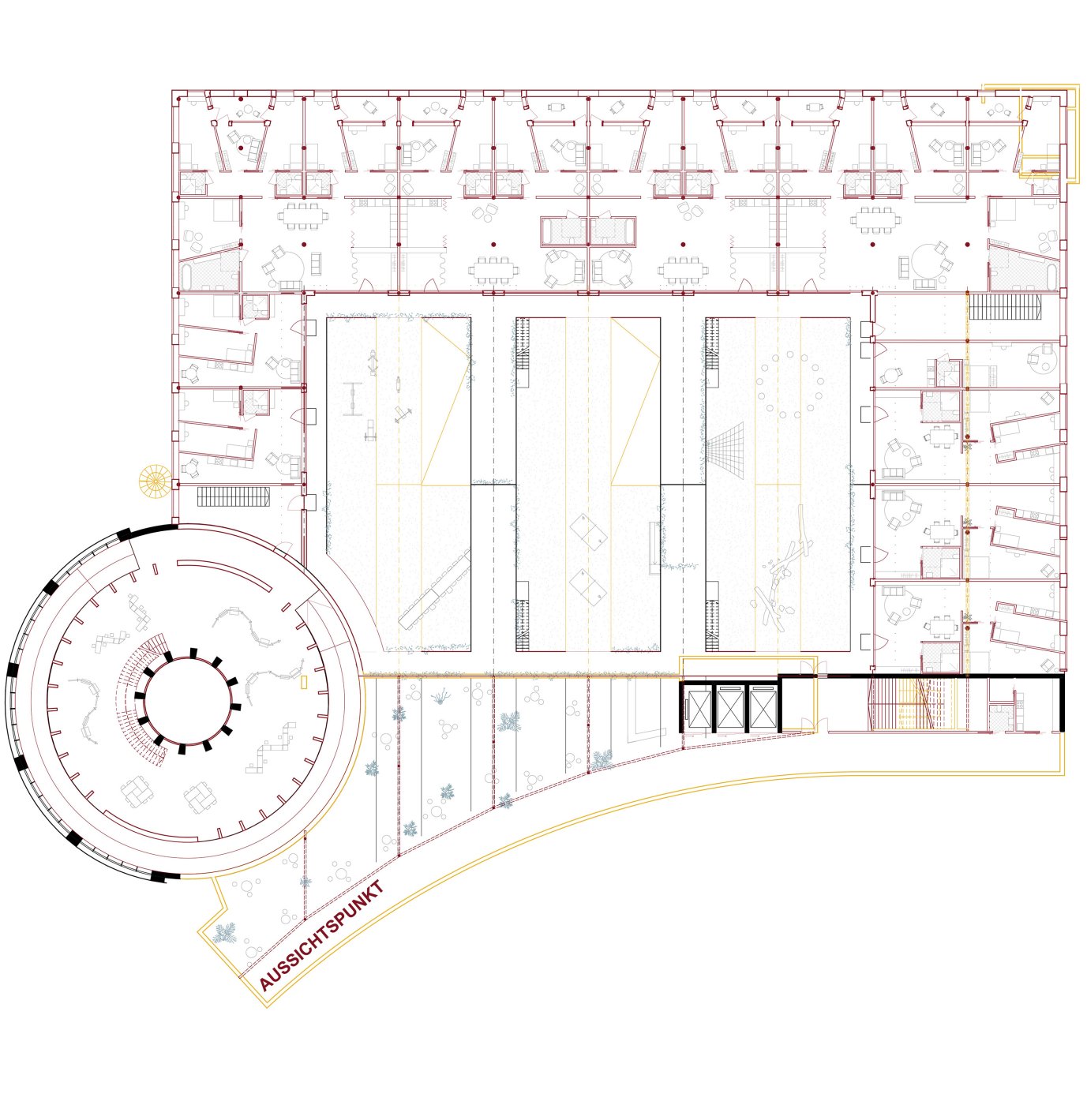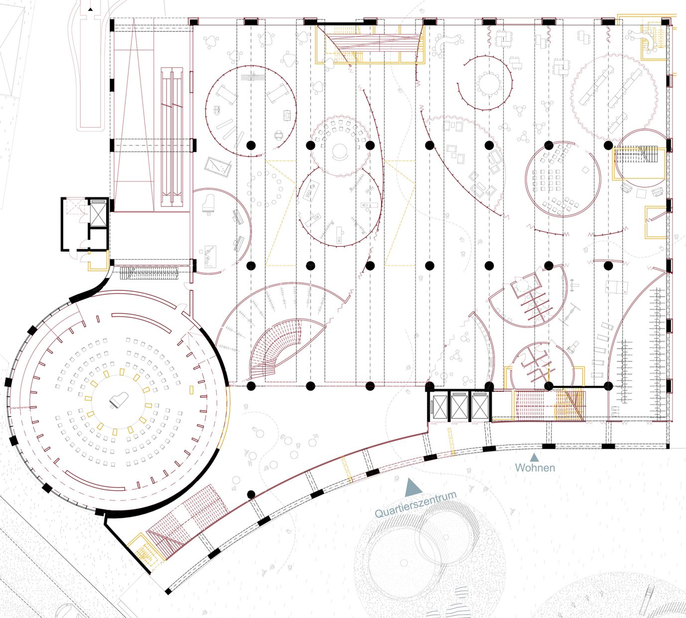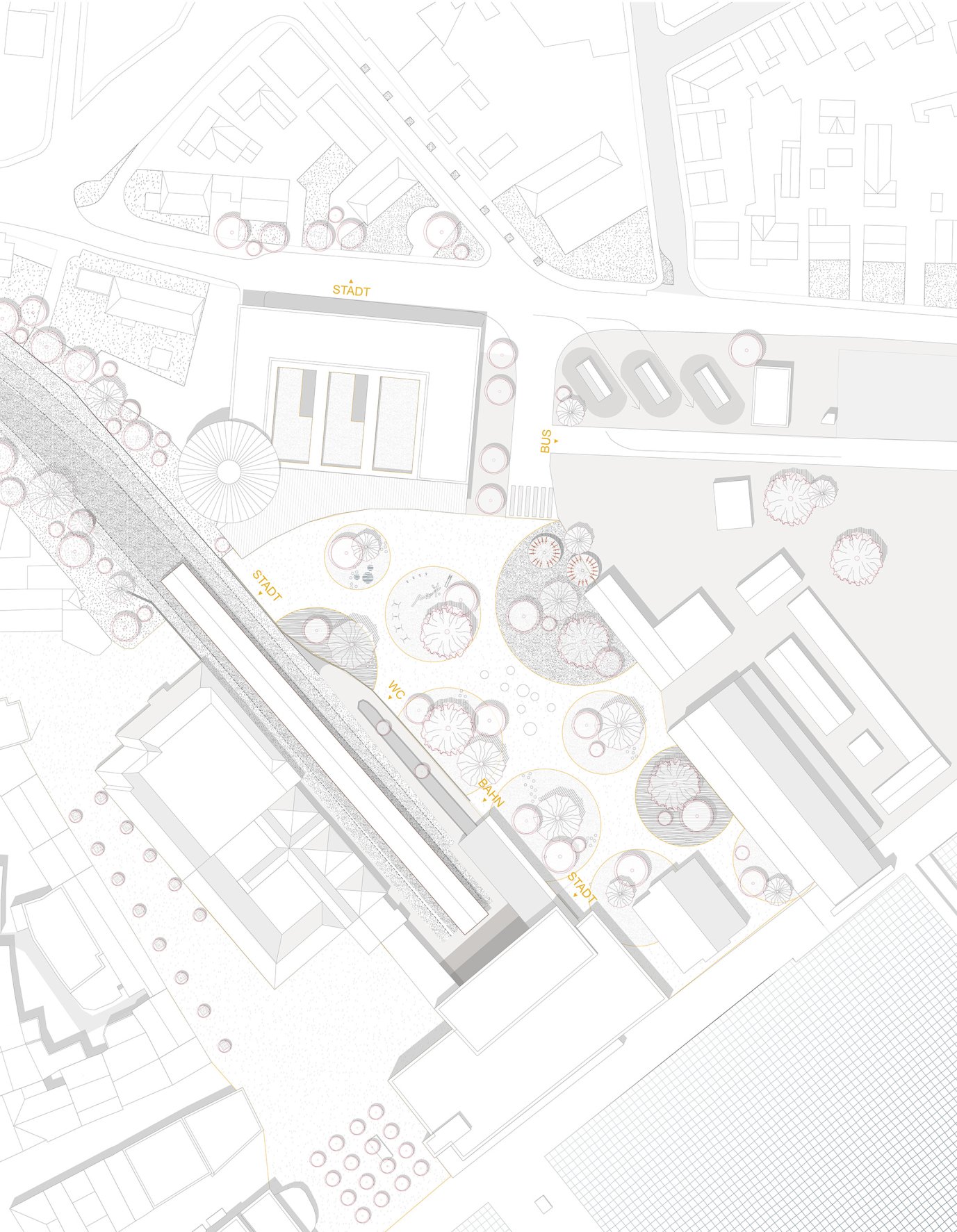 Ziel der Entwurfsaufgabe ist die Transformation eines Parkhauses mit zwei Unter- und fünf Obergeschossen in Friedrichshafen. Das Bestandesgebäude aus den 80er Jahren verfügt über eine weitspannnende Stahlbetonstruktur, welche mehrheitlich weiterverwendet werden soll. Nebst einem Supermarkt, Quartierzentrum soll soll im Gebäude oder durch eine kluge Aufstockung Wohnraum für eine heterogene Zielgruppe entstehen.