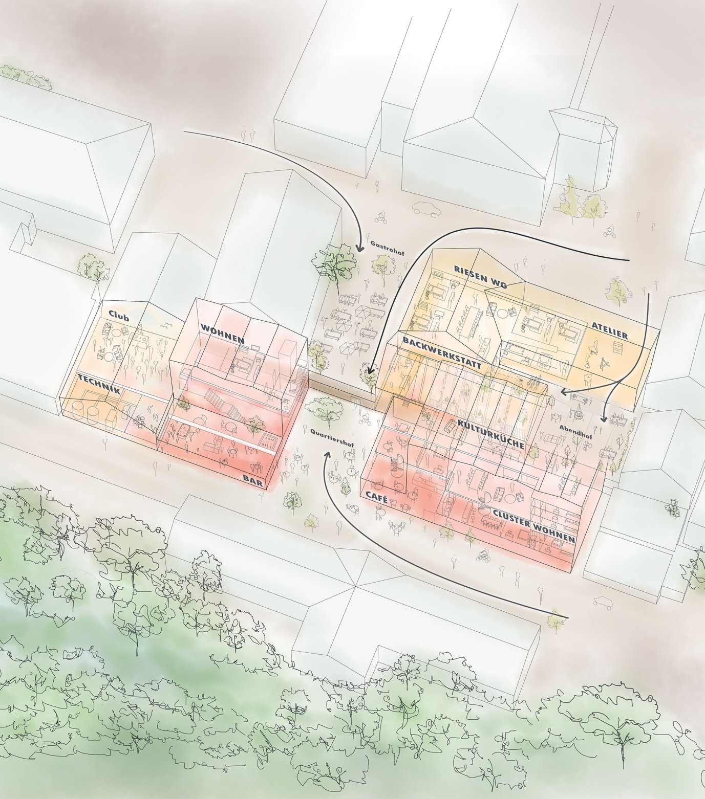 Der Entwurf besticht durch seine umfassende Antwort auf die vielschichtigen Fragestellungen. Das Potential des Areals wird durch die Setzung der Neubauten auf bestechende Weise aktiviert. Die neuen Volumen reagieren trotz der erstaunlichen Grösse sehr subtil auf die bestehende Umgebung. Bestehende Freiräume werden neu gefasst, neue Freiräume werden gezielt geschaffen. Das Nutzungskonzept für das bestehende Gasthaus erlaubt eine Sanierung unter weitgehendem Erhalt der baulichen Substanz. Die notwendige energetische Sanierung wird mit der neuen Fassadenverkleidung sehr klug dazu genutzt das Erscheinungsbild zeitgemäss zu interpretieren. Alt- und Neubauten werden ganz selbstverständlich Teil eines gewachsenen Ensembles. Die vorgeschlagenen Konstruktionen der Neubauten überzeugen durch ihren exemplarischen Charakter und ihre konsequente Entwicklung bis ins Detail. Das beharrliche Ausloten der gestalterischen Möglichkeiten von Material und Konstruktionen geben dem Entwurf einen spezifisch eigenen und trotzdem sehr selbstverständlichen architektonischen Ausdruck.