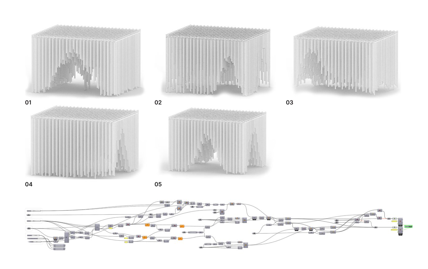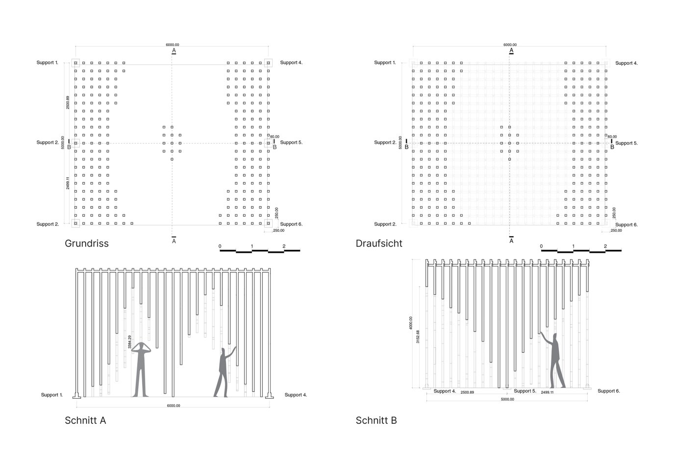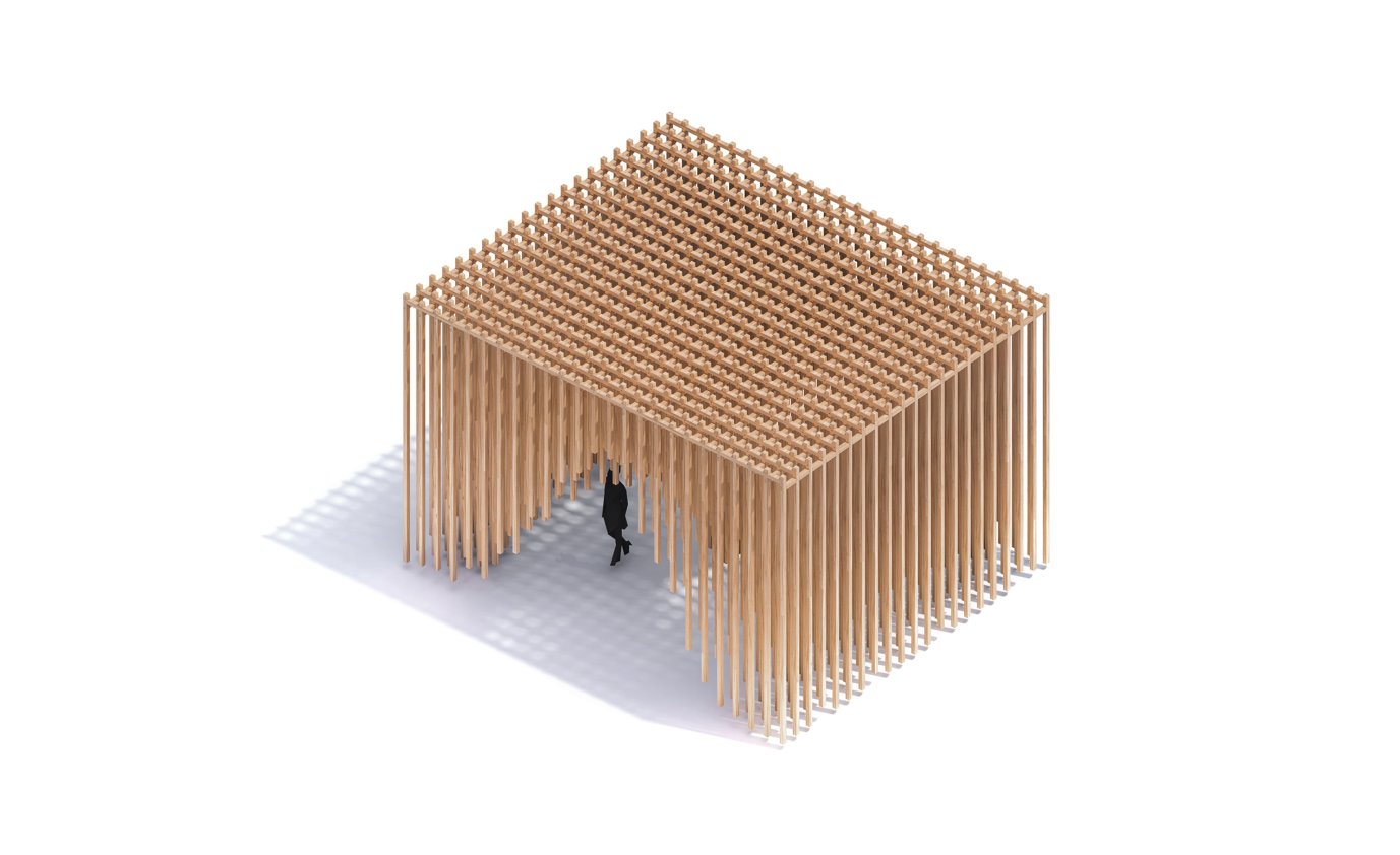 Der gezeigte studentische Entwurf besteht aus Holzelementen, deren variable Längen einen durchlässigen Negativraum umfassen. Die organische Form dieses Raums steht im Kontrast zur streng geometrischen Außenform. Das Gefüge erzeugt spannungsreiche Durchblicke und Muster aus Licht, Schatten und Transparenzen, die sich mit dem Betrachtungswinkel und der Lichtrichtung ändern. Die stabförmigen Holzelemente sind punktuell in unregelmäßigen Abständen am Boden platziert und über horizontale Elemente verbunden. Geschraubte Verbindungen ermöglichen eine einfache Montage und Demontage, die einen Einsatz an verschiedenen Orten ermöglichen.