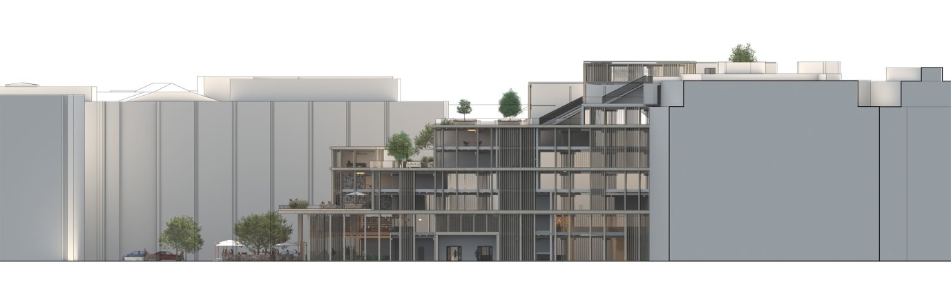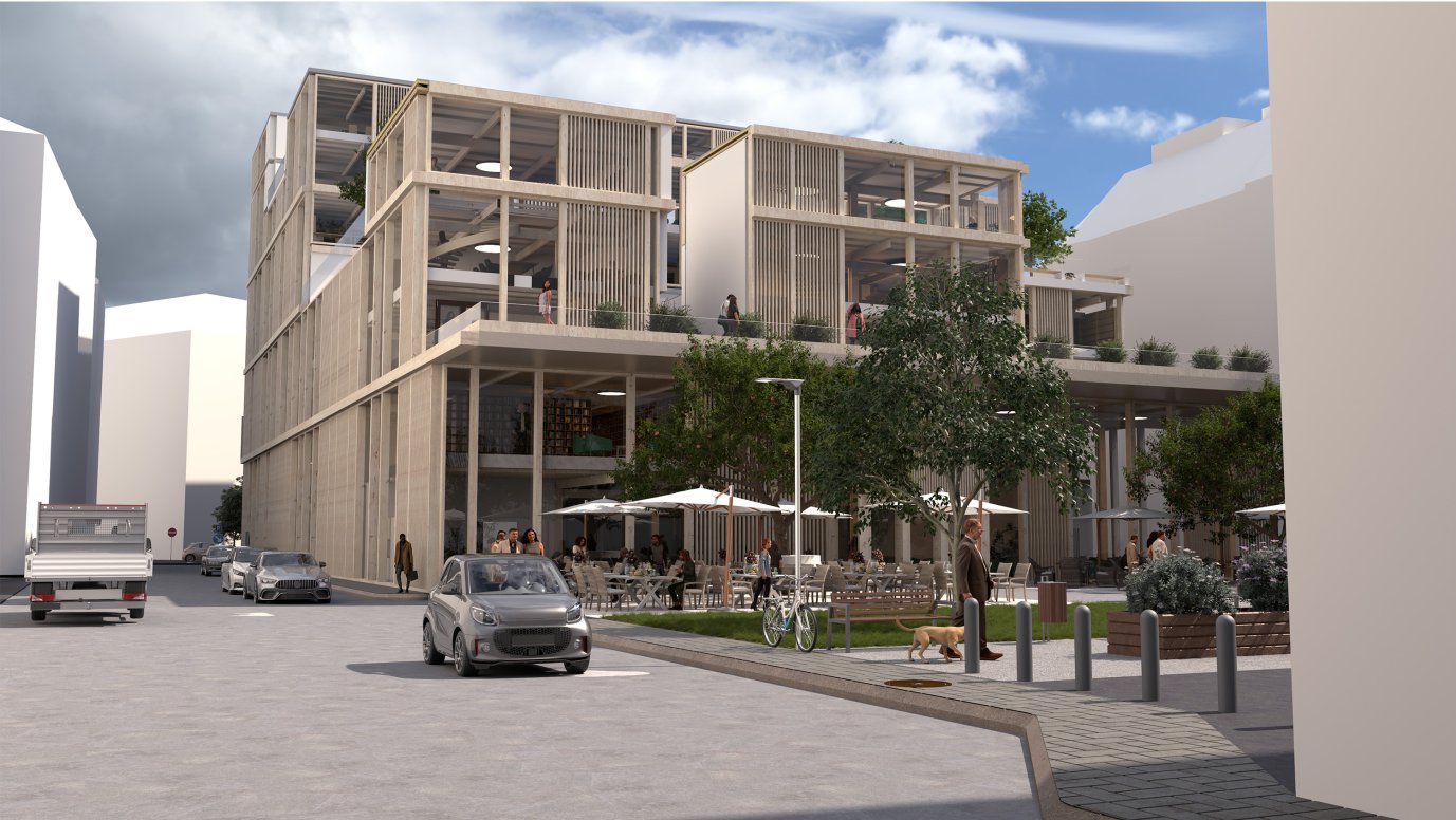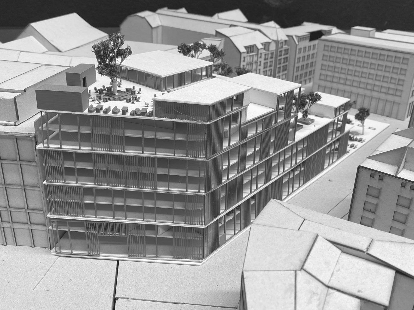 Die Entwurfsaufgabe bestand darin, mitten in der Innenstadt in München einen neuen Ort der Begegnung, der Gemeinschaft ohne Konsumzwang zu erschaffen, für Aufenthalt im Inneren wie auch im Freien. Zentrales Element ist eine Bibliothek und Mediathek, die aber eine neue inhaltliche räumliche Interpretation erfahren soll. Das für den Entwurf zur Verfügung stehende Grundstück wird bisher mit einem zentralen City-Parkhaus genutzt, wir verwenden in unserem Entwurf den Ort als neue Möglichkeit für München, einen kulturellen, offenen Begegnungs- und Gemeinschafts-Ort mit großer Strahlkraft für alle Bürger zu implementieren.
