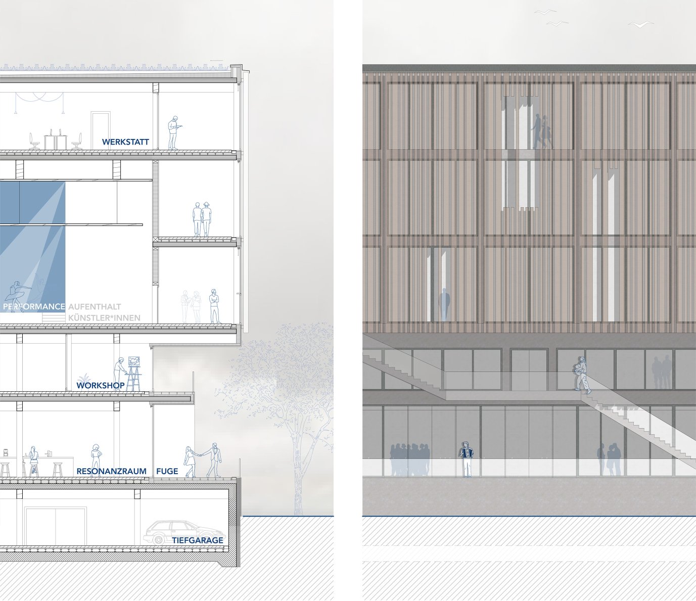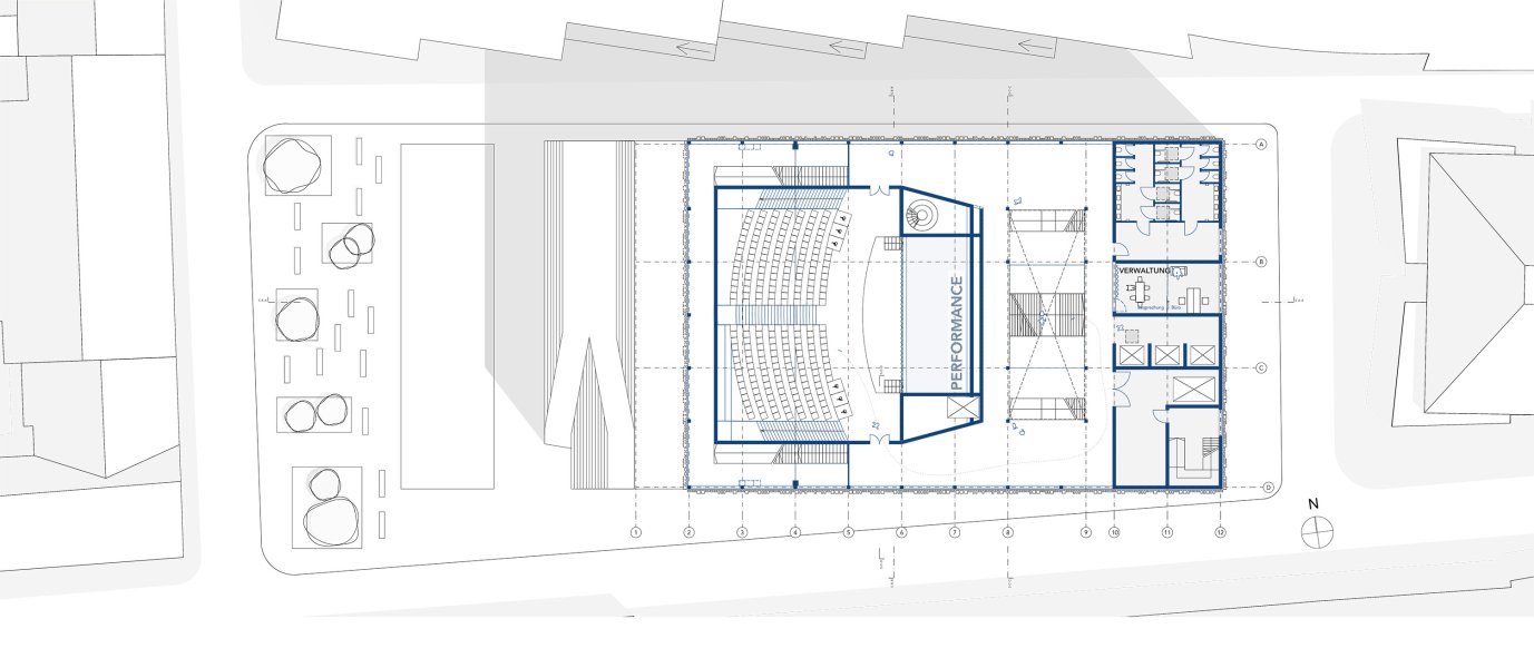 Aufgabe in dieser Bachelorarbeit war es Performance Center für Tanz und Theater zu entwickeln. Ein Haus, das auf unterschiedlichen Ebenen eine Plattform der Aneignung, des Experiments, des Austausches sein kann – mit verschiedenen Akteuren aus unterschiedlichen sozialen Schichten, unterschiedlicher Herkunft, unterschiedlichen Alters – mit dem Ziel, insbesondere Jugendlichen, aber auch Erwachsenen und Kindern ein Forum zu geben, in dem diese die Chance erhalten, sich auszuprobieren, Wirksamkeit zu erhalten und im besten Falle Relevanz im öffentlichen - und damit im politischen - Raum zu entfalten. Ort des Projektes ist ein Grundstück im südlichen Bahnhofsviertel in München, einem Viertel, das von einem überaus lebendigen Miteinander unterschiedlichster Menschen und Kulturen geprägt ist.