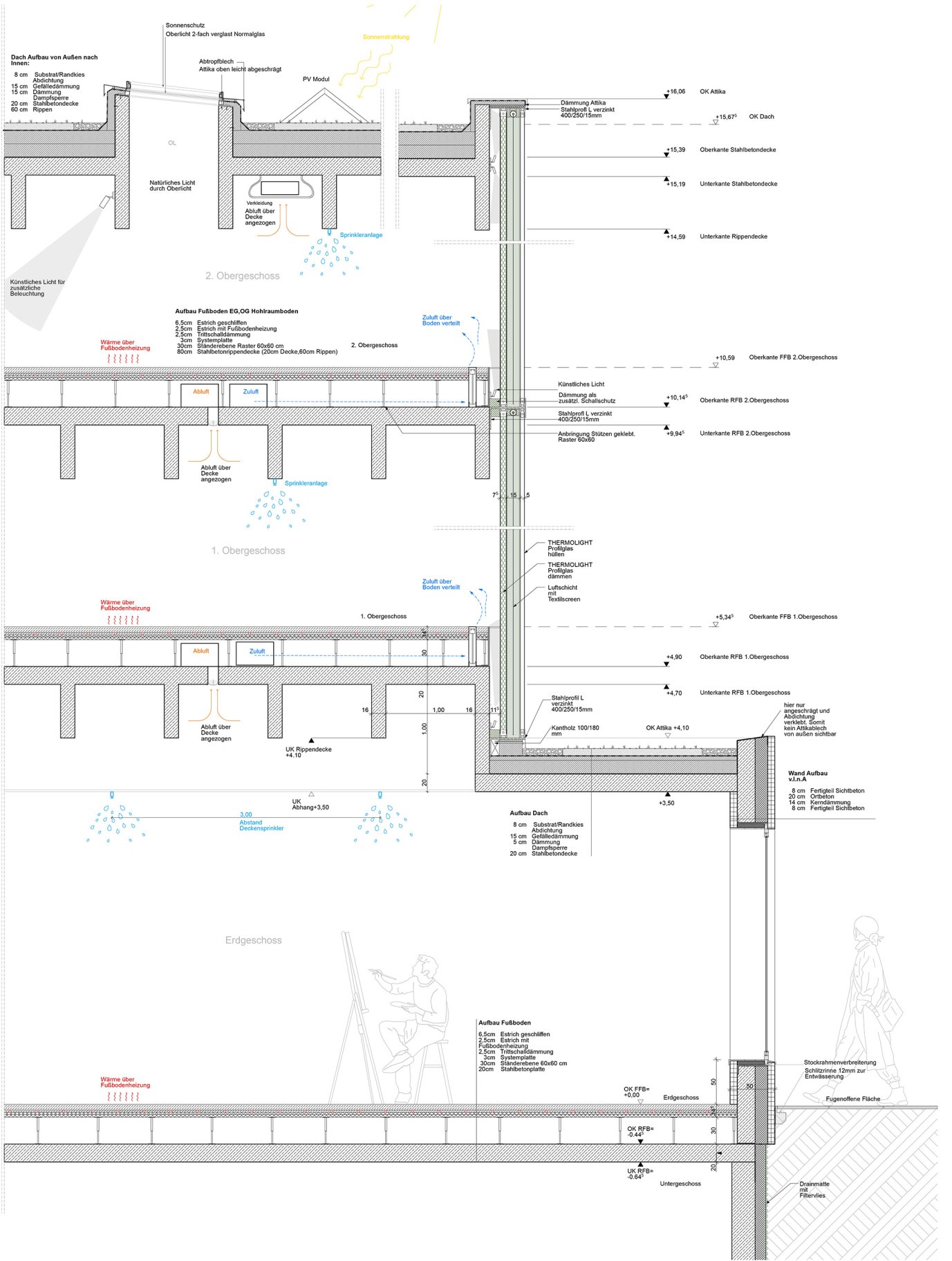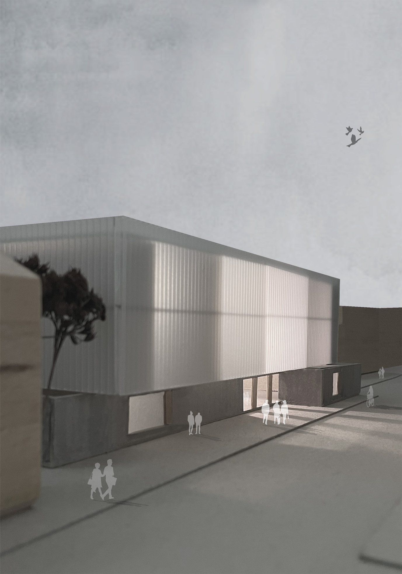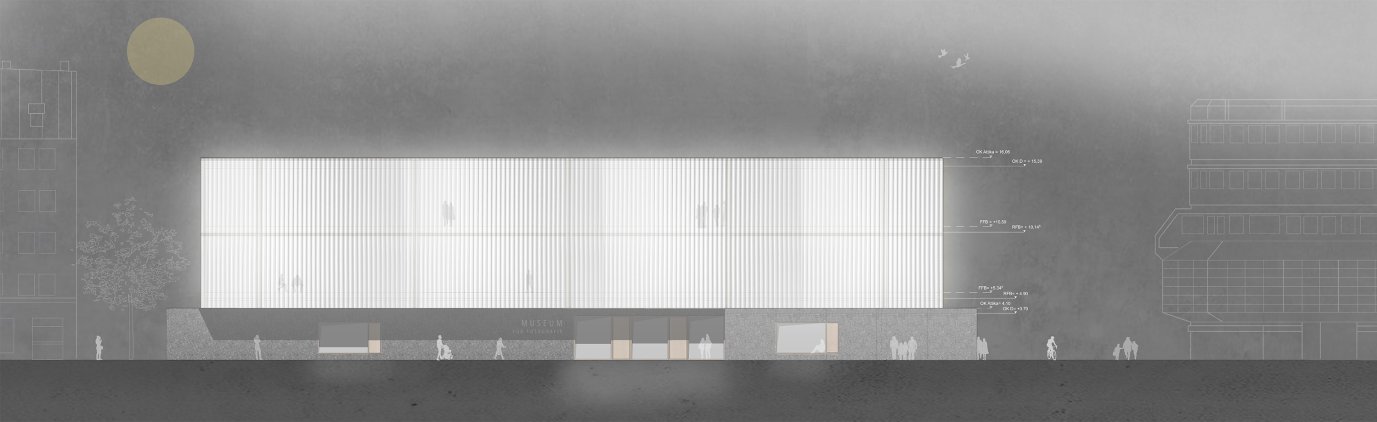 Dieses Projekt beschäftigt sich mit Frage des Sockels in der Stadt. Der Entwurf versucht dem massiven Sichtbetonsockel mit einzelnen großen Öffnungen, einen „schwebenden“ mit einer durchlaufenden transluzenten Hülle versehenen Ausstellungskörper gegenüberzustellen. Die klare konstruktive Gliederung in tragende Schotten, die auch die infrastrukturellen Themen beinhalten schaffen eine überzeugende räumliche Struktur, die einen vielfältigen Ausstellungsbetrieb ermöglicht.
