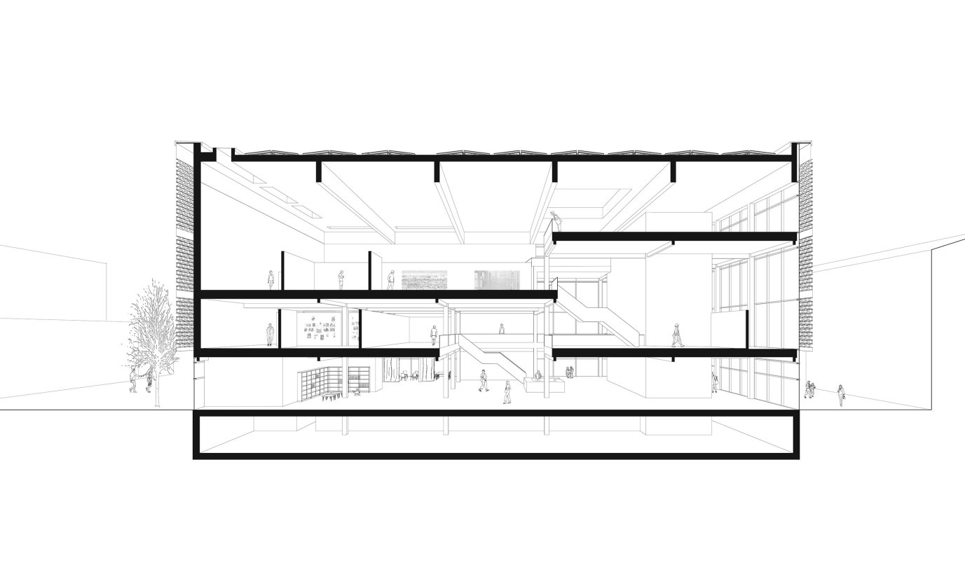 Dieses Projekt überzeugt durch seine räumlich komplexe Wegeführung durch das Gebäude. Drei frei stehende, tragende Kerne (in denen sich Erschließung und Technik befinden) gliedern die Flächen und ermöglichen unterschiedliche Raumzuschnitte über die 3 Geschosse. Vielfältige Ausstellungssituationen sind dadurch möglich.Eine zweite Hülle aus unterschiedlich gekanteten „Metallkacheln“ nehmen Bezug zum ursprünglich auf dem Grundstück befindlichen Hortenkaufhaus. Diese zweite Haut sorgt für unterschiedliche , der Nutzung angepasste Belichtungsverhältnisse, und geben dem Gebäude ein sehr eigenständiges Erscheinungsbild.