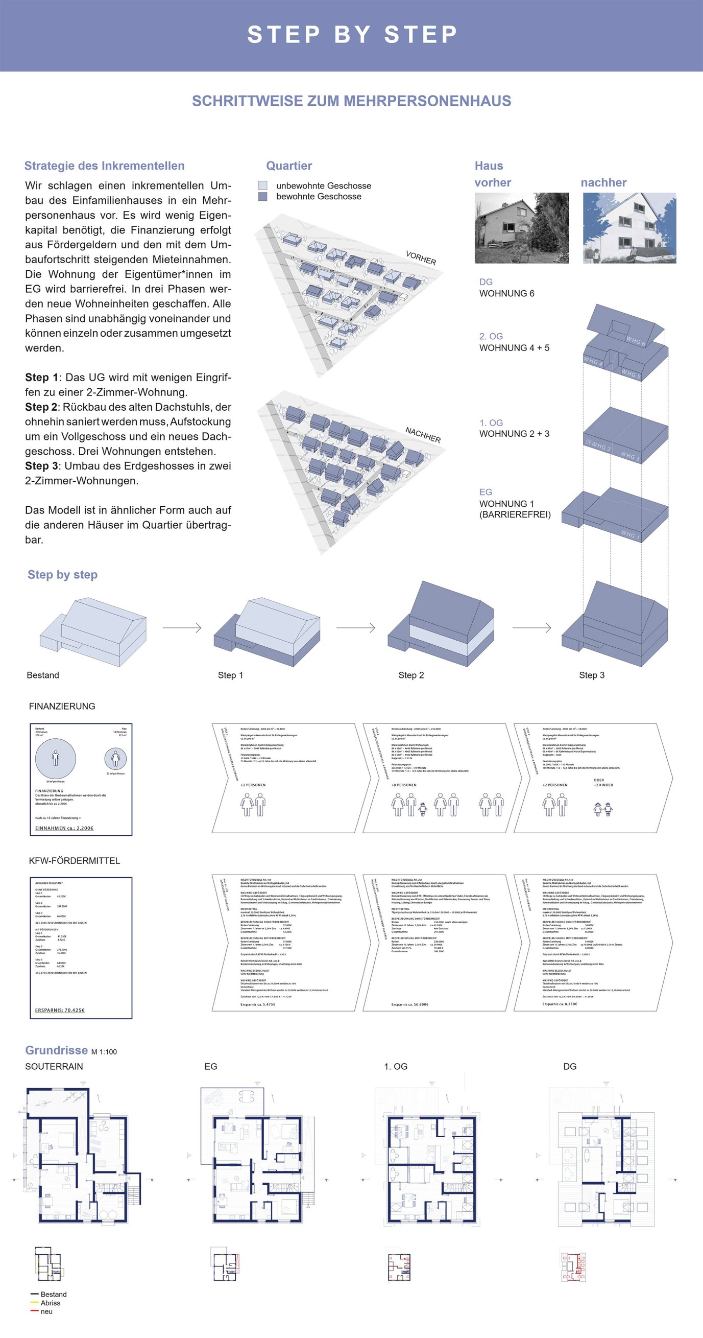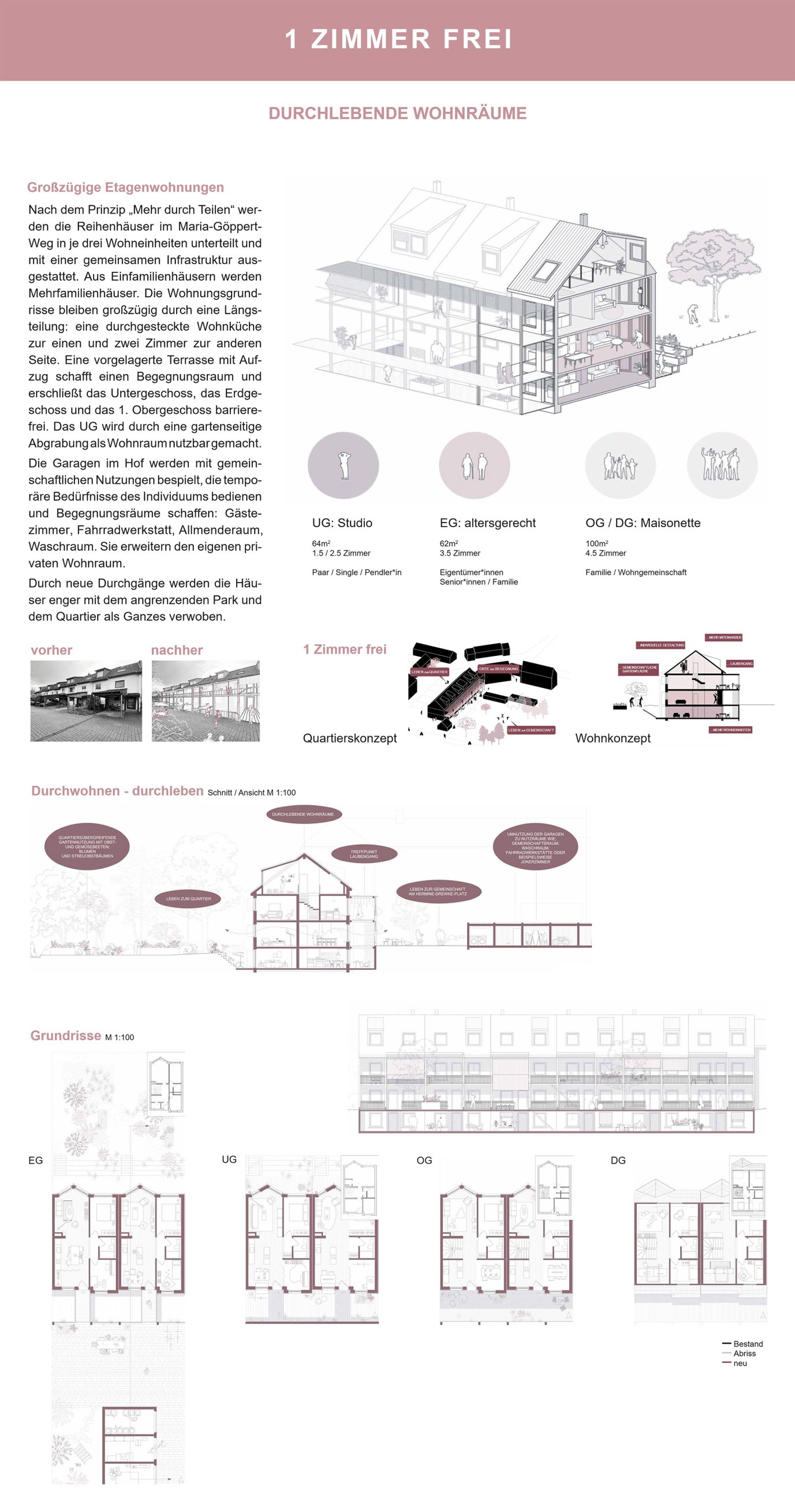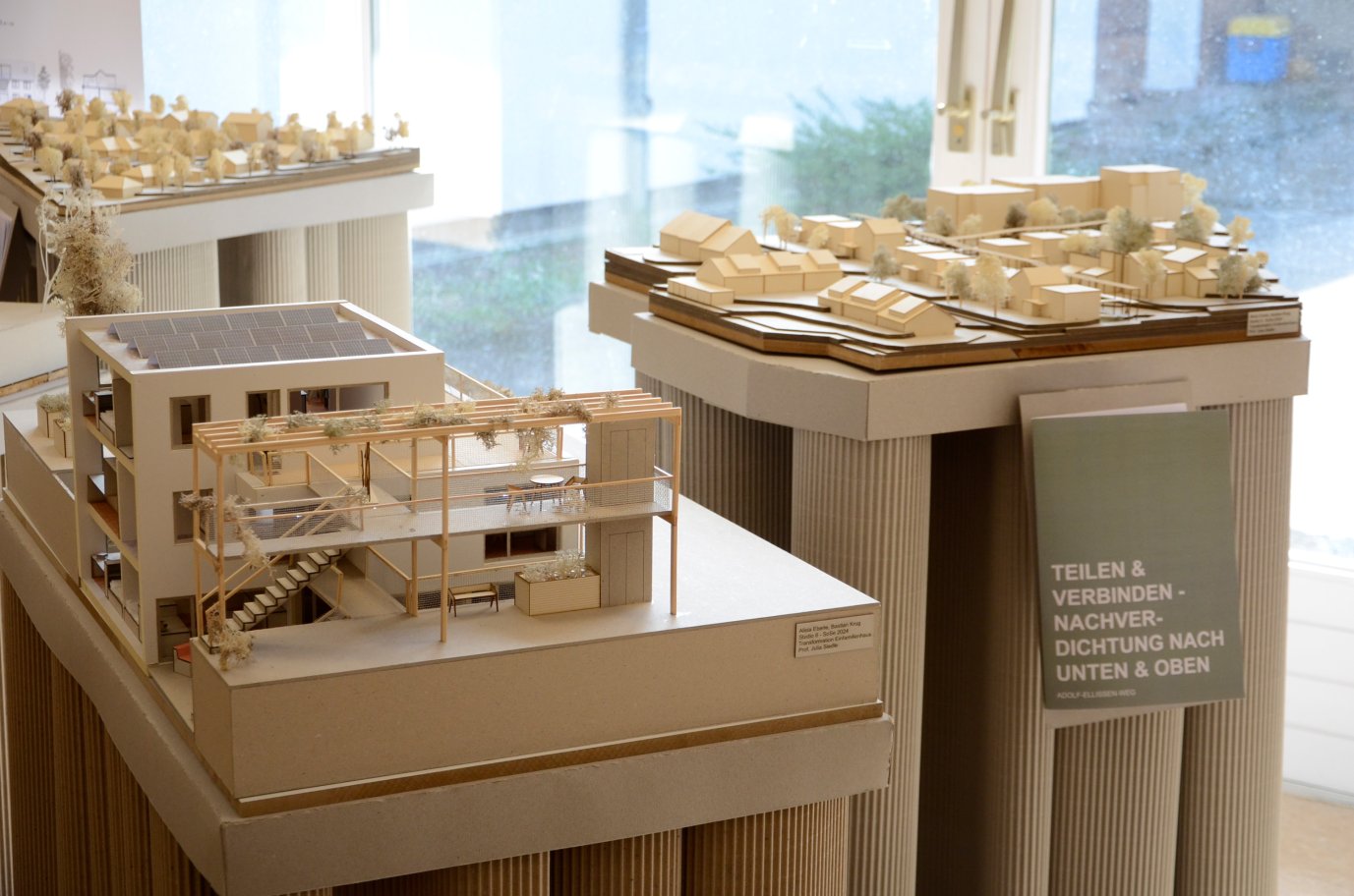 Das Einfamilienhaus ist die beliebteste Wohnform der Deutschen. Bundesweit gibt es 16 Millionen davon, und ein großer Teil dieser Häuser ist untergenutzt. Es sind Zimmer frei – und gleichzeitig fehlt es an Wohnraum. In einem Entwurfsstudio wurden am Beispiel von vier Häusern in Göttingen verschiedene Strategien erarbeitet, wie die freien Zimmer sich zum verdichteten Wohnen nutzen ließen - ausgehend von den Anforderungen und Wünschen der Eigentümer*innen und unter sozialen, ökologischen und ökonomischen Aspekten. Die Studierenden formulierten konkrete Ideen und Ansatzpunkte für neue Nutzungskonstellationen, für bauliche Veränderungen und für kommunales Handeln.Die Ausstellung wurde sowohl im Stadtteil Weende Nord als auch im Neuen Rathaus Göttingen präsentiert. Die Ausstellungsgestaltung entstand im Rahmen eines Wahlpflichtfaches.