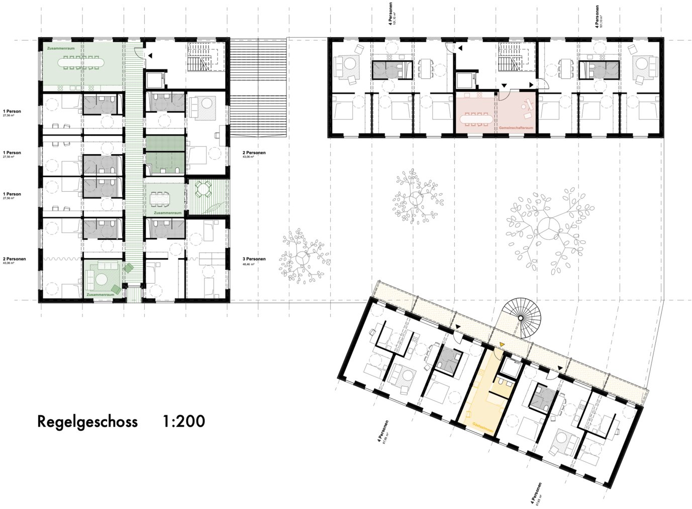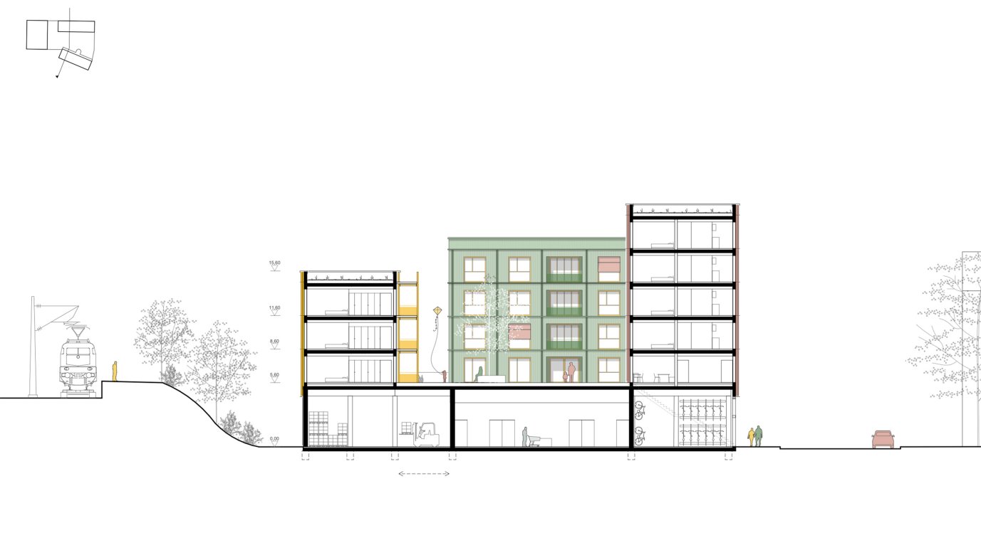 Im Rahmen eines Wettbewerbs der Joanes-Stiftung wurde ein Entwurf gesucht, der Wohnungen mit einem sehr hohen Qualitätsanspruch mit Blick auf vielfältiges und teilweise gemeinschaftliches Wohnen, aber auch Bezahlbarkeit mit einem Supermarkt mit all seinen logistischen Anforderungen verbindet. Die Arbeit löst diese Aufgabe durch drei einander zugewandte, von einer gemeinsamen Ebene aus erschlossene Baukörper in Holzskelettbauweise, die bei relativer Kompaktheit und Dichte eine große Bandbreite an Wohnungstypen anbieten. Das Erdgeschoss ist durch den Treppenaufgang und eine „dicke Wand“ mit gewerblichen und gemeinschaftlichen Nutzungen lebendig. Bereichert wurde die Arbeit am Entwurf durch Fachvorträge zu Befahrbarkeit, Konstruktion und gemeinschaftlichem Wohnen sowie durch eine inspirierende Exkursion mit Führungen durch verschiedene Wohnbauten in Zürich.