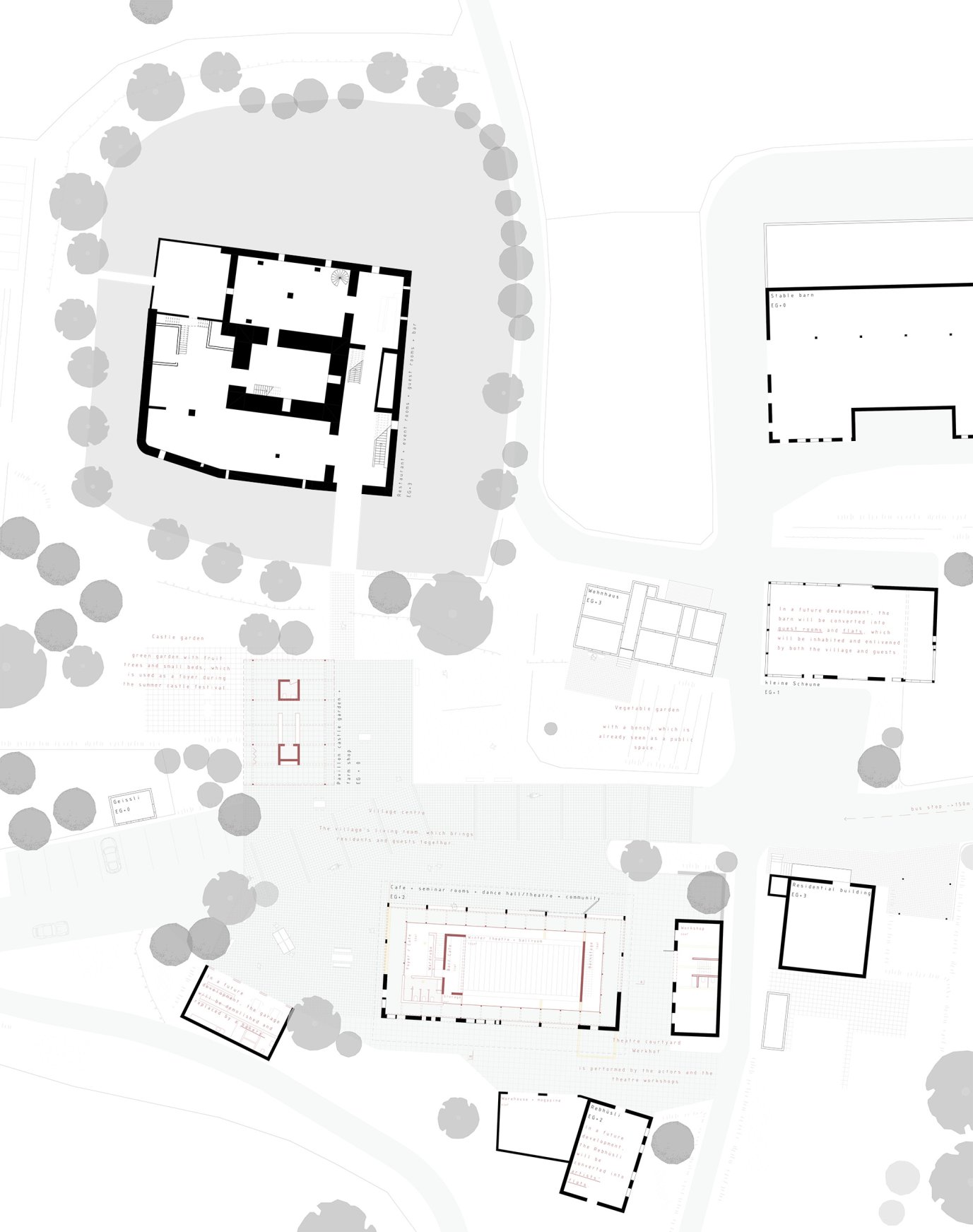 Weiler sind typische und prägende Elemente der Kulturlandschaft in der Schweiz, ihr primärer Zweck der Landwirtschaft verliert aber immer mehr an Kraft. Wie können die baukulturellen Qualitäten der gewachsenen Struktur nicht nur erhalten, sondern auch für die Zukunft angepasst werden? Wir möchten dieses Semester nutzen um freudvoll und kreativ an die Verdichtung im Weiler heranzugehen. Der historische Kontext bietet uns hierbei vielerlei Hilfestellung; Wir analysieren das Ortsbild, die Aussenräume, Baumbestände, das denkmalgeschützte Wasserschloss, Haupt-und Nebengebäude auf deren Bauweise und Materialierung, deren Ausdruck und erarbeiten mit der Nutzung eines Seminarzentrums eine innere Verdichtung des Ortes Hagenwil. Der Weiler Hagenwil ist Teil einer Moränenlandschaft, welche früher weit ausgedehnte Moore besass, von welchen heute noch zwei Moore übriggeblieben sind (Hudelmoos und Heldswiler). Im Weiler soll getagt und getanzt werden. Ein Umbau, Neubau oder Erweiterung schafft Raum für Seminargäste und die Dorfbewohnern einen Tanzsaal. Das Raumprogramm ist dabei sinnfällig mit den vorhandenen Strukturen und Angeboten im Weiler zu verteilen.